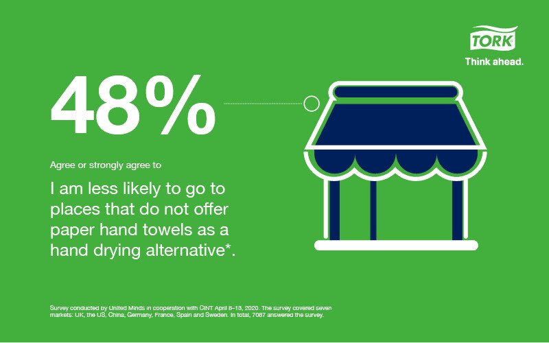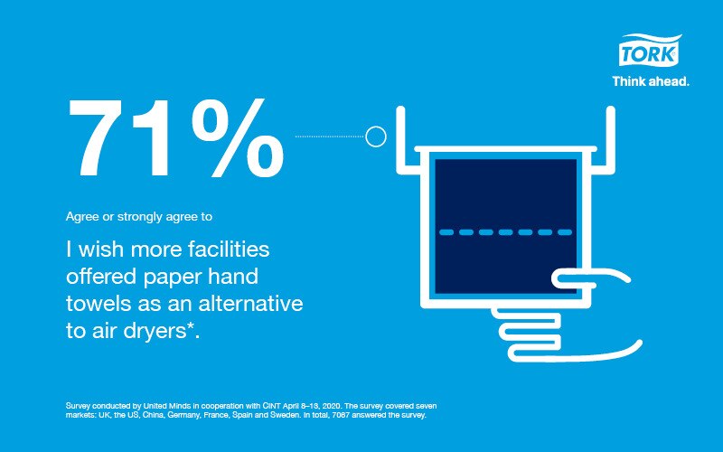 A COVID-19 tornou os utilizadores finais mais conscientes dos riscos para a saúde decorrentes de uma higiene deficiente, exercendo pressão sobre os sanitários públicos para satisfazer as exigências dos visitantes. Em comparação com as toalhas de mão de papel, os secadores de ar a jacto produzem mais gotículas no ar*, aumentando o risco de propagação de bactérias, e hoje em dia até 43% sentem-se inseguros ao entrar numa casa de banho com secadores de ar. Certifique-se de que os seus visitantes se sentem seguros: mude para soluções de toalhas de mão de papel Tork.
